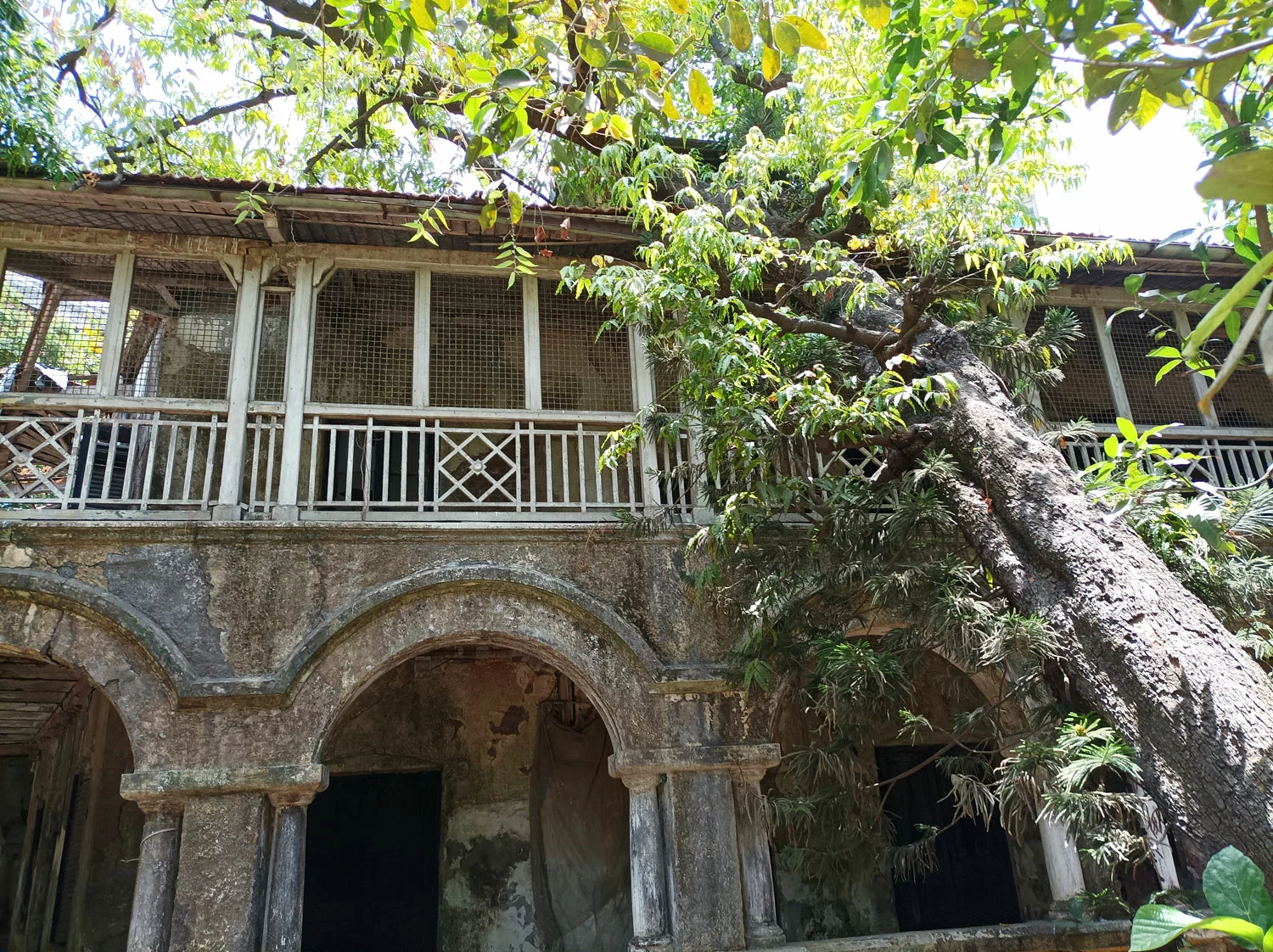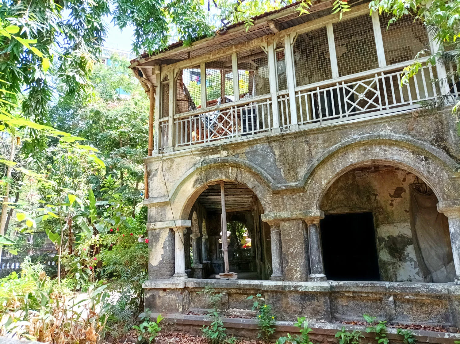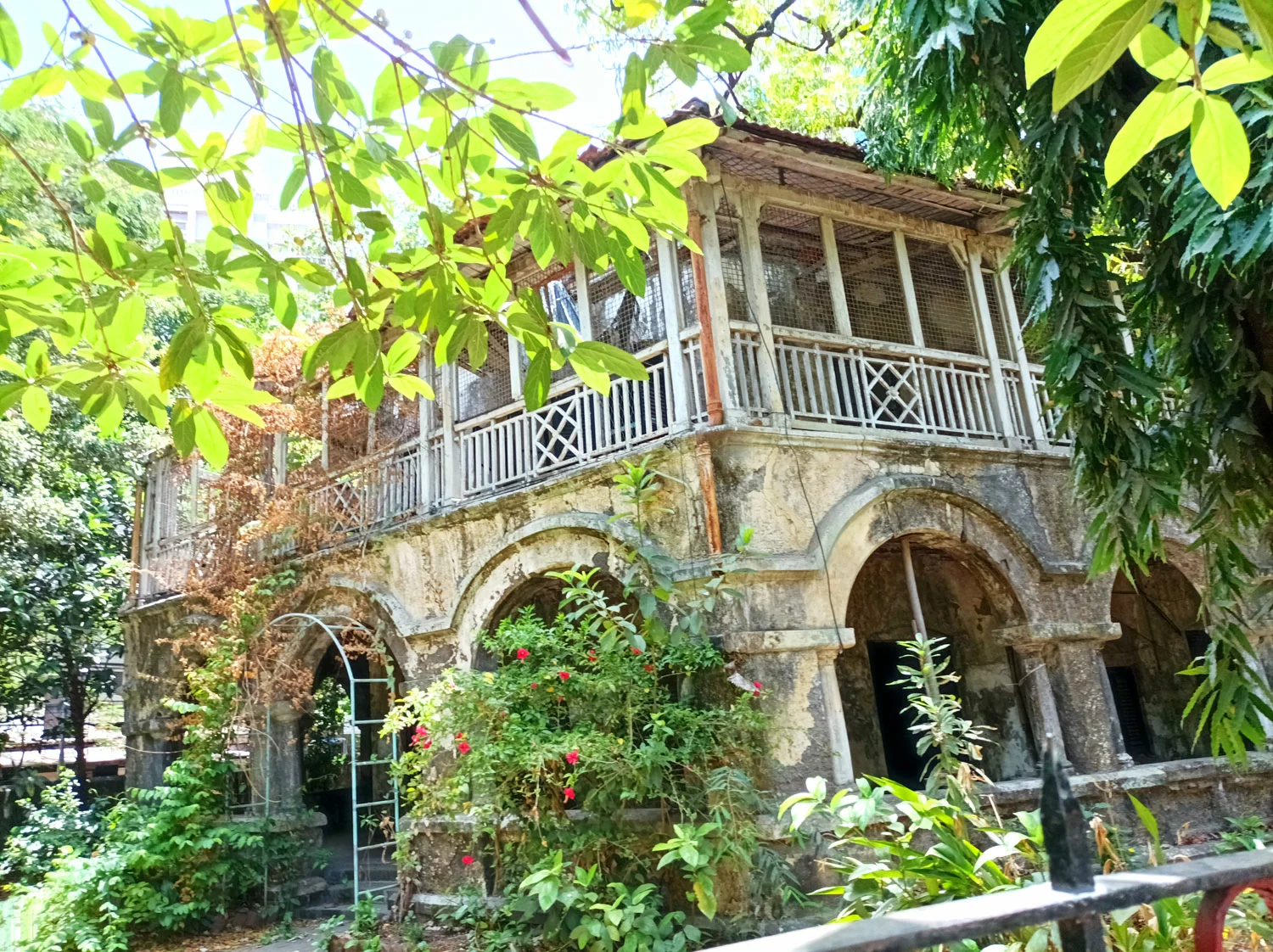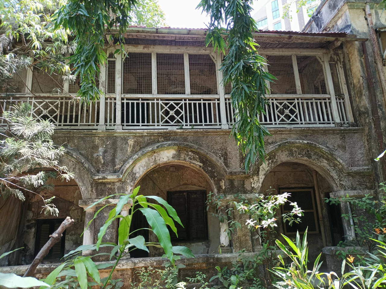 Großangelegte Grundstücke mit verfallenen kolonialen Bauten zwischen den Hochhäusern in Central Mumbai